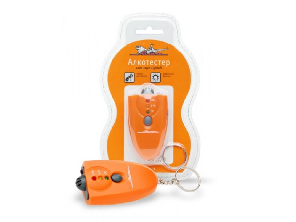 Алкотестер светодиодный определяет уровень алкогольного опьянения бесконтактным способом. Информация о содержании алкогольного вещества в крови испытуемого демонстрируется через светодиодные элементы, размещенные на панели алкотестера. Устройство оснащено диапазоном измерения 0-1,9 промилле. Изделие выполнено в фирменном оранжевом цвете AIRLINE.