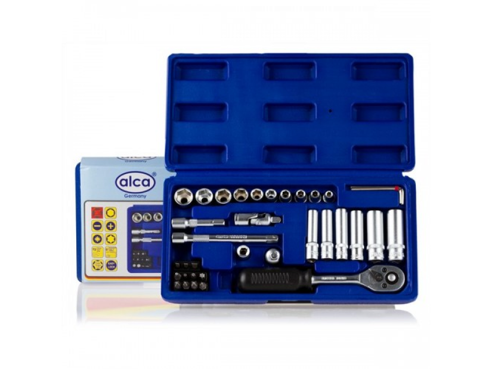 Набор головок, 37 предметов. 10 - шестигранных головок 4-13 мм. 6 - шестигранных длинных головок 6-13 мм. 1 - трещётка. 1- карданный шарнир. 2 — удлинителя 5 см. и 10 см. 3 — шестигранных ключа 1.5; 2;2.5. 1- держатель бит. 1- адаптер 1/4(М)*3/4(F). 11 — битТ10-Т30(+) 1,2 (+) 1,2(-)3,4,5. Качественная ванадиевая сталь. Крутящий момент +15%. Крепкий инструментальный ящик.