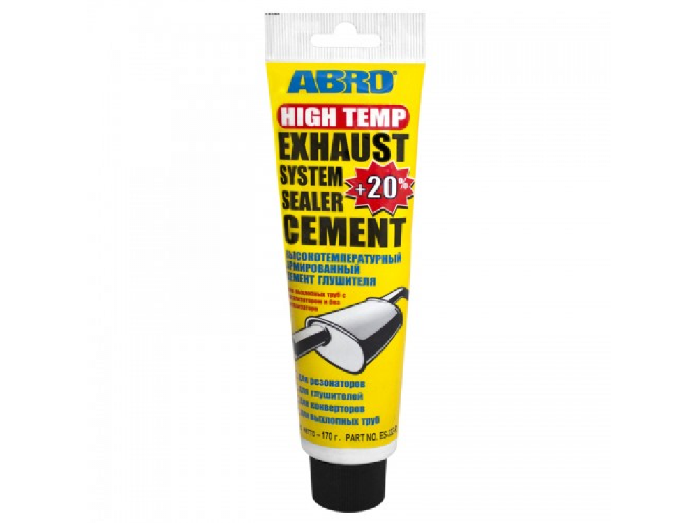 Цемент глушителя ABRO выдерживает температуру до 1100 С и идеален для сборки герметичных соединений в новых выхлопных системах, для устранения небольших дырок и трещин в глушителях, выхлопных трубах, каталитических конвертерах, резонаторах и т. д. Может с успехом применяться и в бытовых целях как высокотемпературный клей.