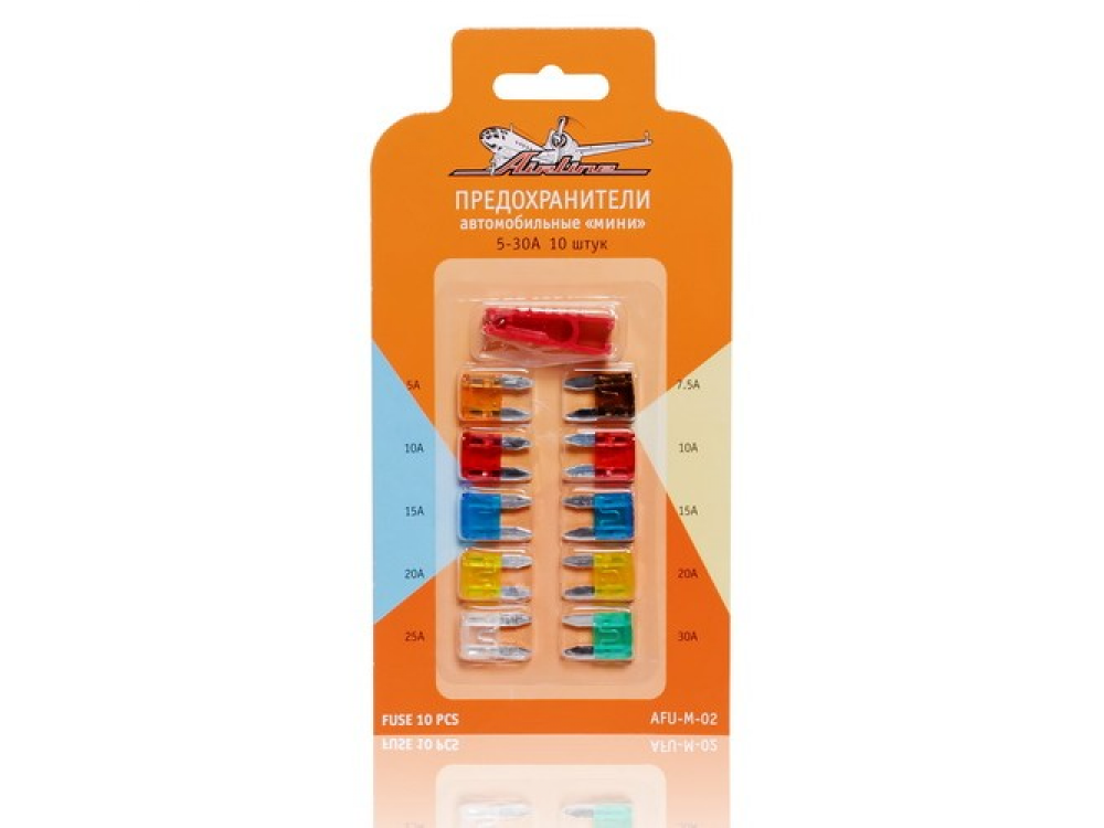 Производитель AIRLINE представляет набор компактных предохранителей категории «мини» в прозрачной блистерной упаковке. Номинальный ток изделий в зависимости от предохранителя составляет от 5А до 35А. Общее количество предохранителей в одной упаковке составляет 10 штук. Для установки предохранителей в электрическую цепь автомобиля необходимо следовать инструкции.