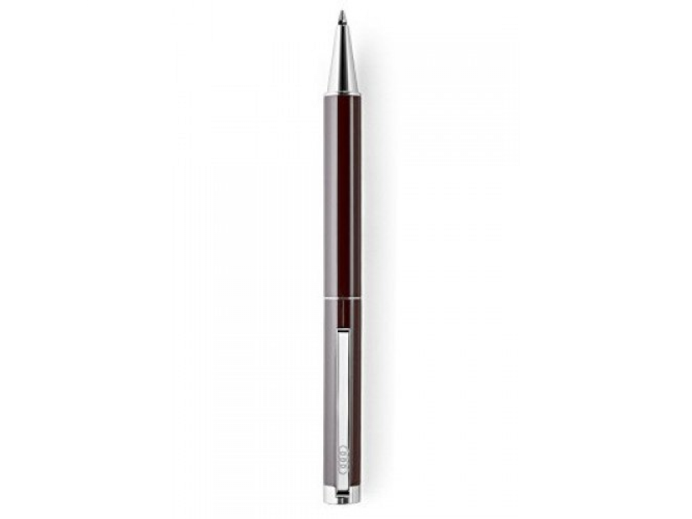 Ручка в металлическом корпусе коричневого цвета с поворотным механизмом и блестящими хромированными элементами, гравировка логотипа Audi на зажиме. Стандартный стержень синего цвета, типа Capeless, средняя толщина линии при письме. Артикул: 322.11.005.00